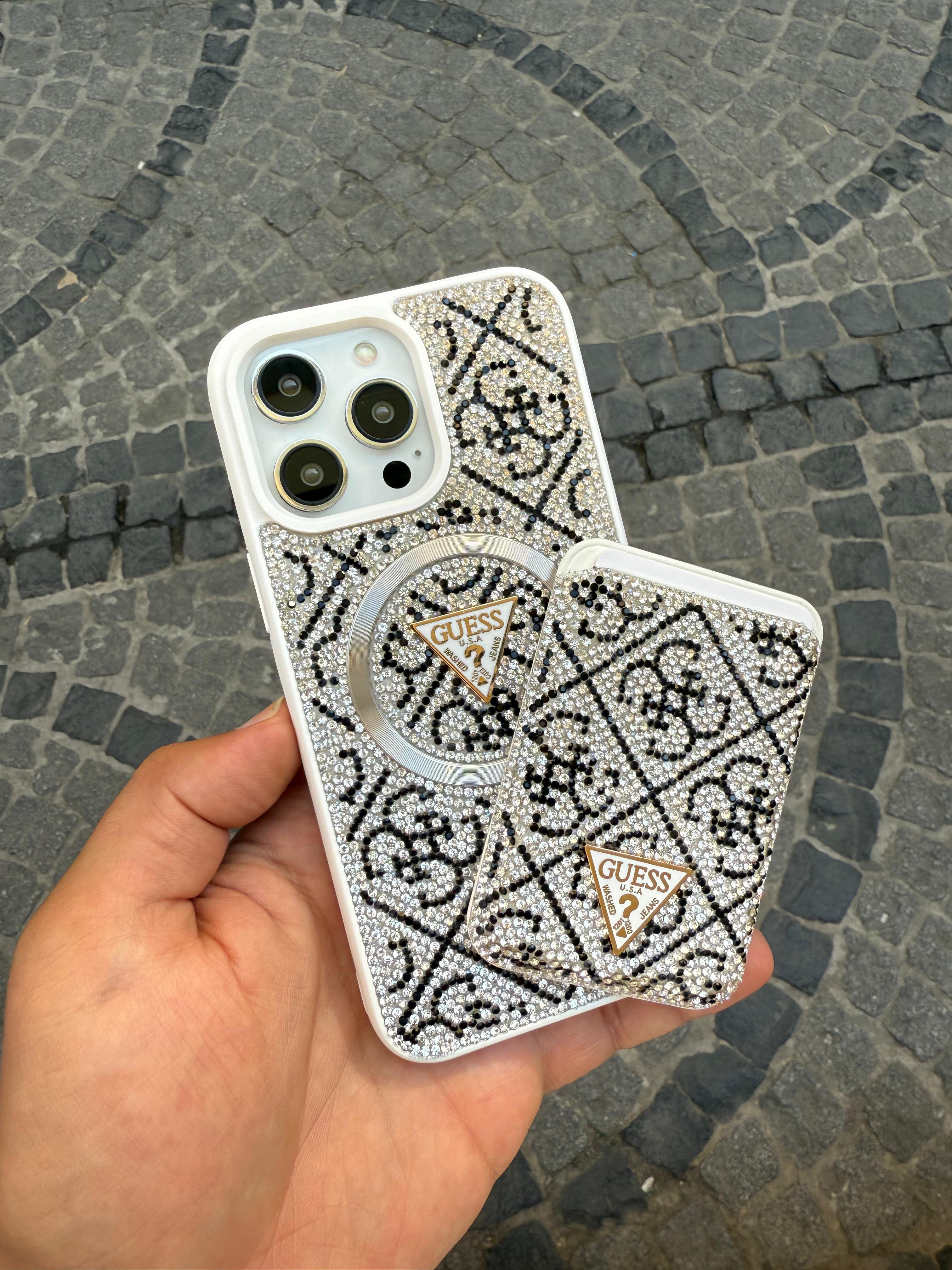 Guess Taşlı Kartlıklı Magsafe Özelikli Kartlıklı BEYAZ renk Telefon Kılıfı