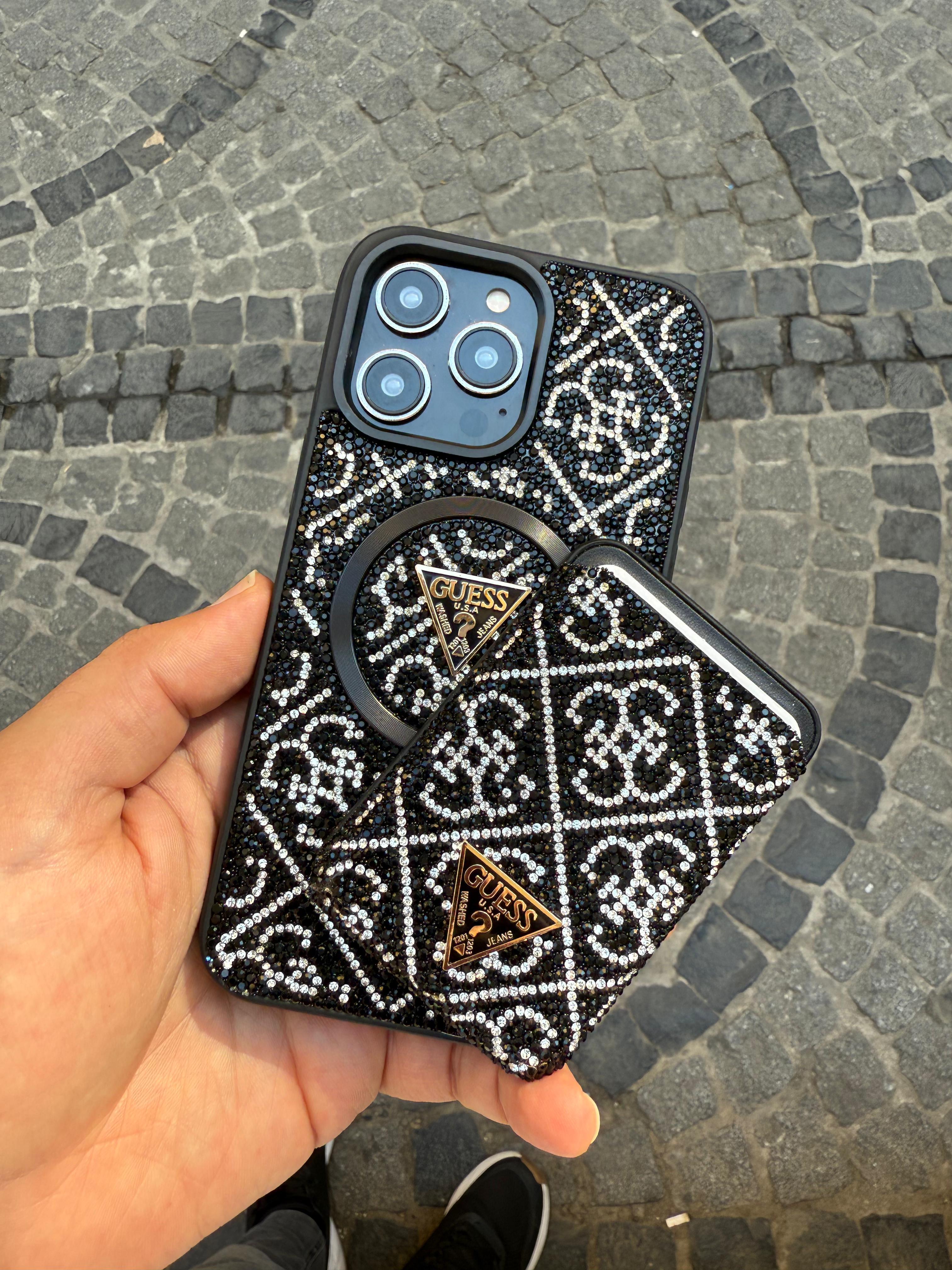 Guess Taşlı Kartlıklı Magsafe Özelikli Kartlıklı SİYAH renk Telefon Kılıfı