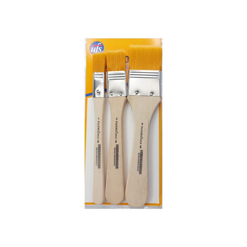 Pagoda Gold 106 Zemin Fırça Seti, 1, 3 ve 5 numara fırçalardan oluşan 3'lü bir settir. Fon çalışmaları, eskitme ve kenar boyama gibi dekoratif uygulamalarda, küçük ve orta boy yüzeylerde kontrollü sonuçlar elde etmenizi sağlar.