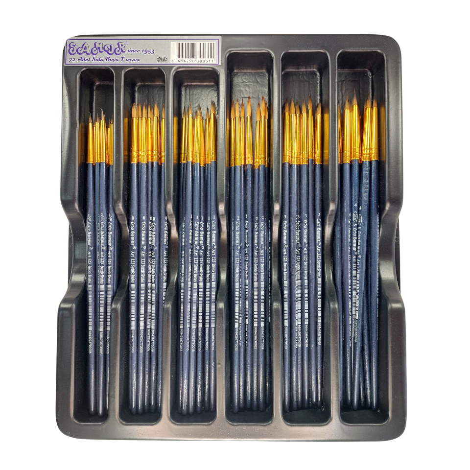 Samur 123 Gold Sentetik Sulu ve Akrilik Boya Fırçaları, orta sertlikte kaliteli sentetik uçları ve dayanıklı yapısıyla hem öğrenciler hem de sanatseverler için güvenilir bir seçenektir. 72 adet fırçadan oluşan bu set, her biri farklı numarada olan 6 çeşit fırçayı şeffaf plastik stand içinde sunar. Düzenli sergileme ve kolay erişim imkanı sunar.