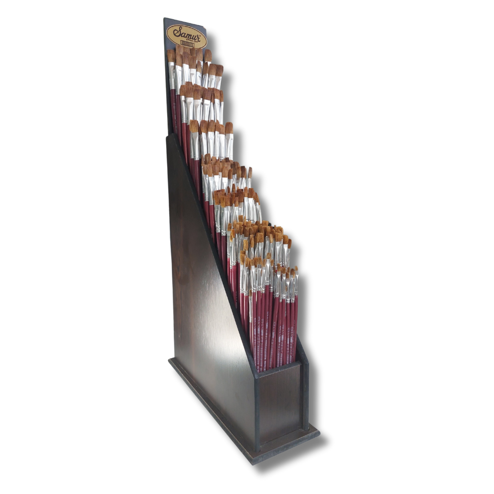 Samur 228’li ağaç stand, akrilik ve yağlı boya uygulamaları için özel olarak geliştirilmiş, farklı numaralardaki fırçaların bir arada sunulduğu toptan satışa uygun profesyonel bir sergileme çözümüdür.