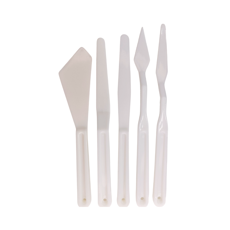 Samur 5'li Plastik Spatula Seti, akrilik boya, guaj boya, tekstür uygulamaları ve rölyef çalışmalarında kullanılan, farklı şekillerde 5 adet spatuladan