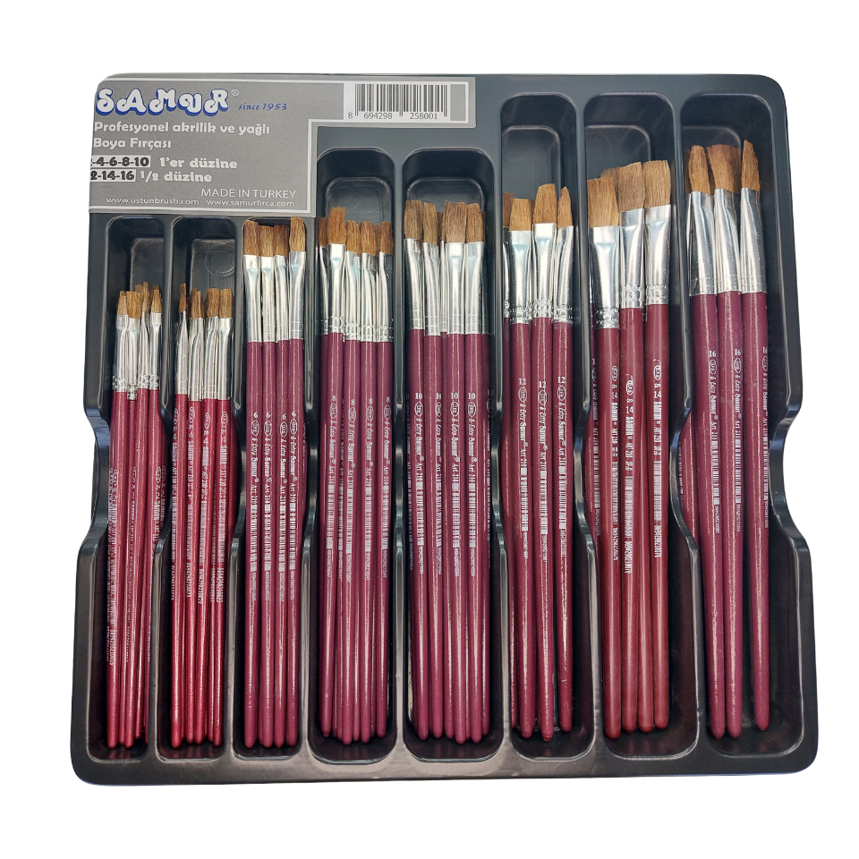 Samur 78’li plastik stand, akrilik ve yağlı boya çalışmaları için ideal numaralardaki fırçaları bir arada sunan kompakt ve düzenli bir sergileme çözümüdür.