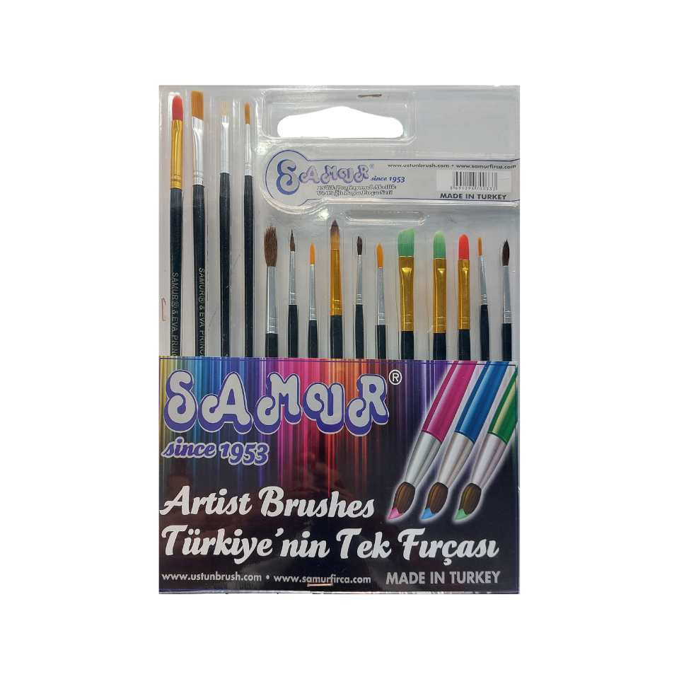 Samur Sanatsal 15'li Fırça Seti, hem Sulu ve Akrilik boya hem de yağlı boya teknikleriyle çalışmak isteyen kullanıcılar için hazırlanmış karışık boyutlarda fırçalardan oluşur.