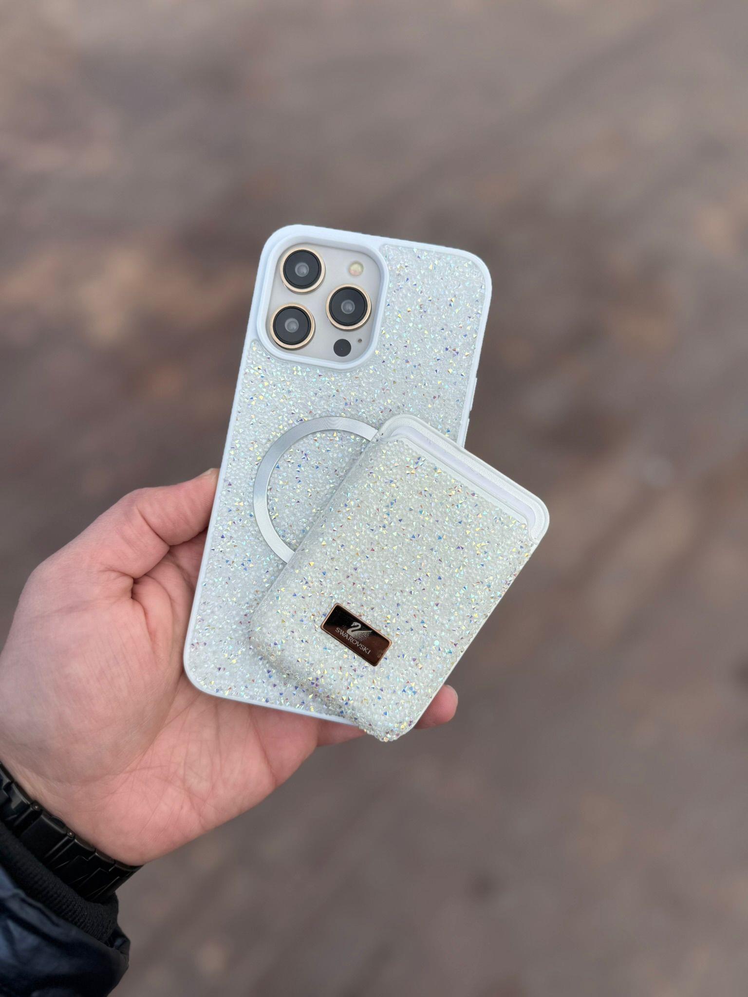 Swaroski Taşlı Magsafe Özelikli Kartlıklı BEYAZ renk Telefon Kılıfı